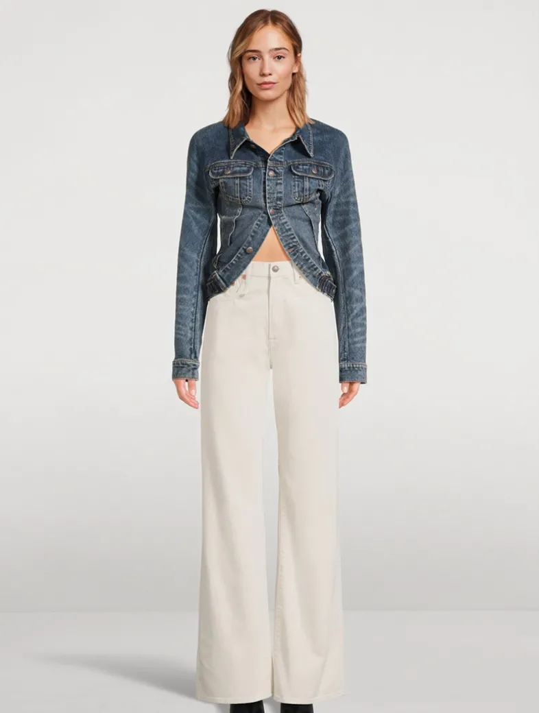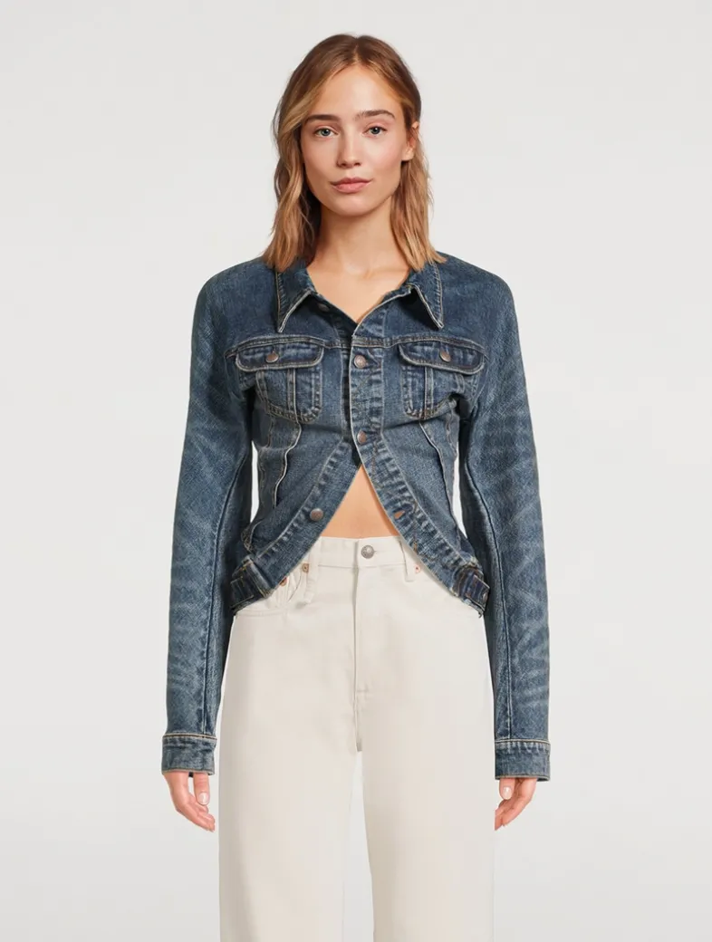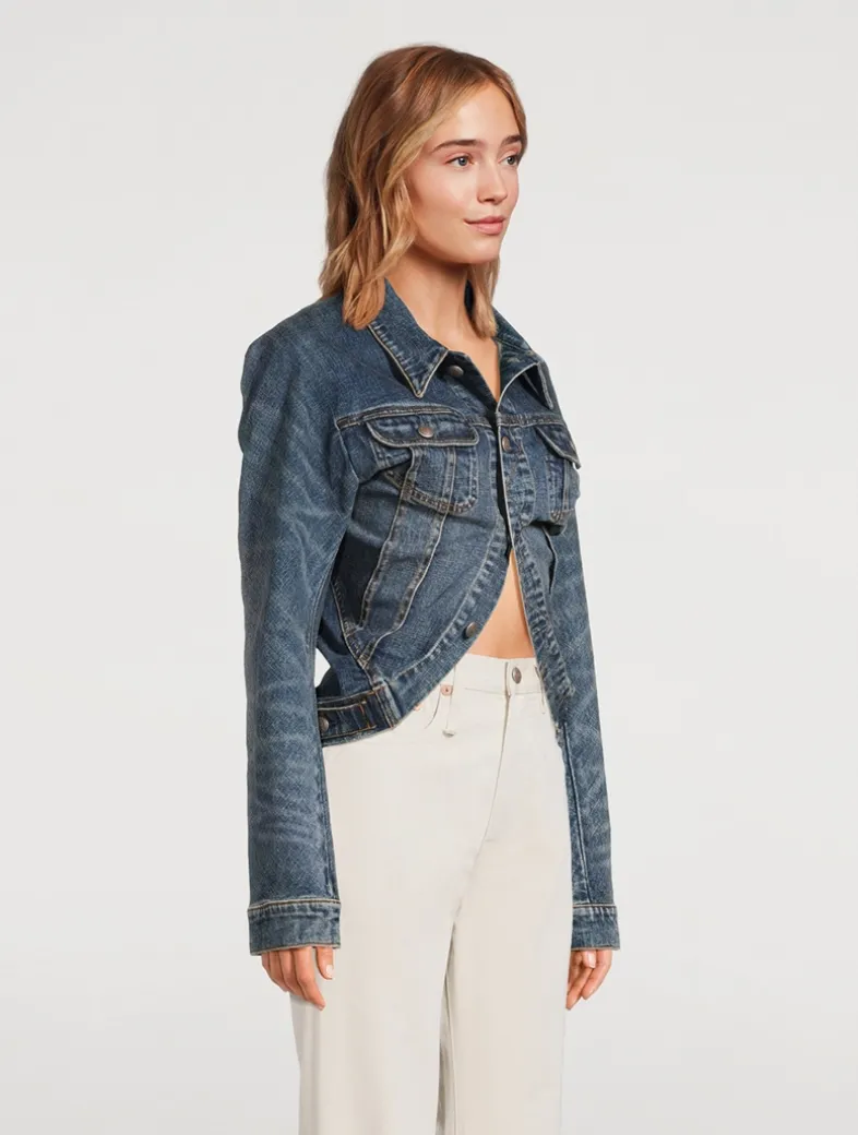 This wrap-around jacket features an altered placket that extends around the waist and side pleats for fullness. Built with stretch denim.