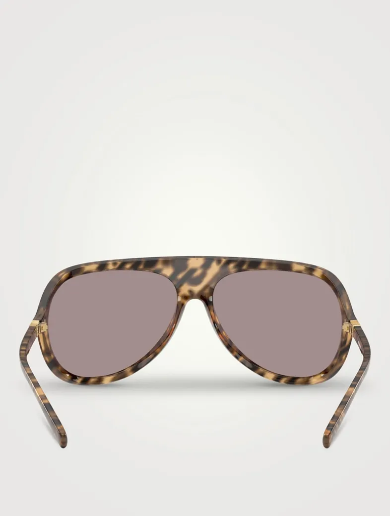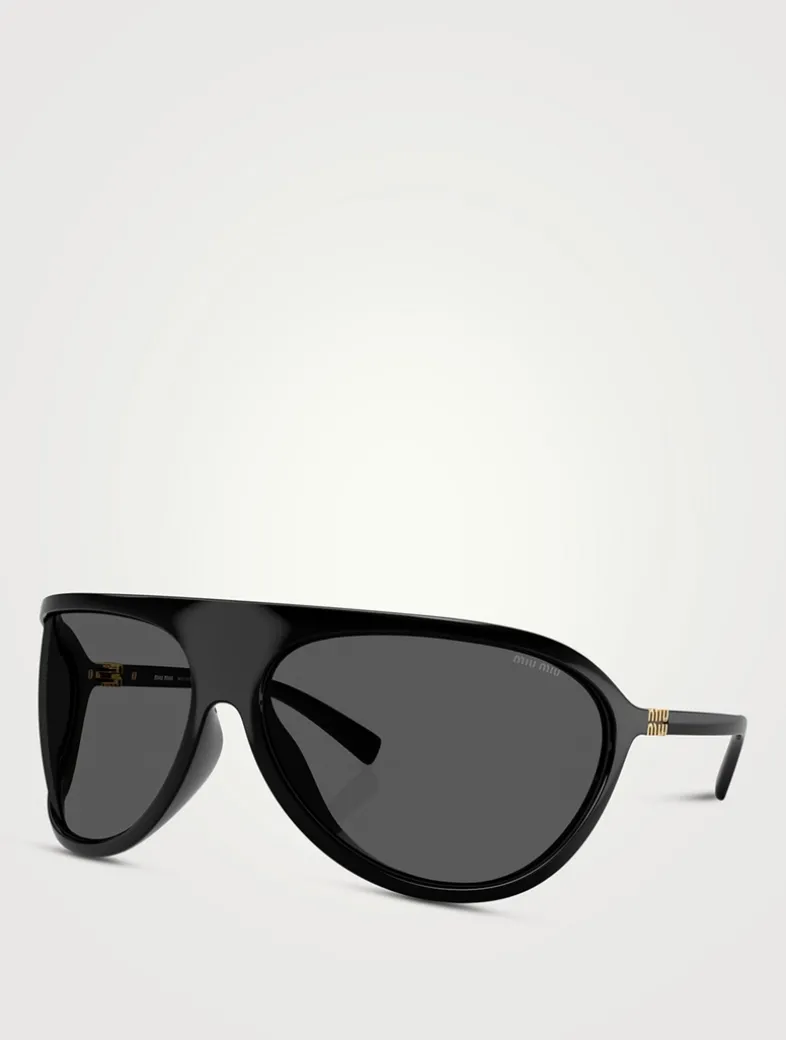 Crafted from full acetate with a bold, wraparound aviator shape, these sunglasses are adorned with a gold-coloured Miu Miu vertical logo on the thin temples.
