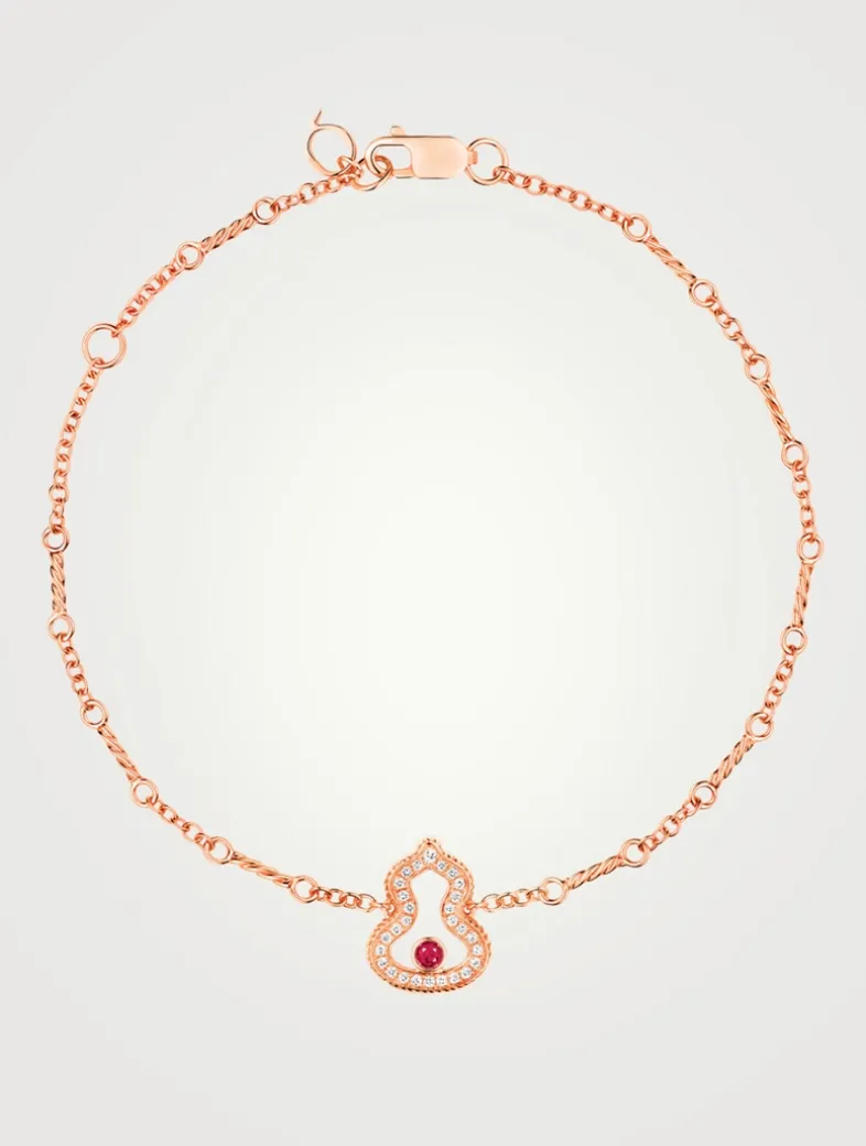 Echoing the curves of the lucky number 8, Wulu is the most powerful symbol of good fortune and positive energy in China. Set on a chain of twisted and mixed links, this bracelet features an open Wulu pendant traced with 28 diamonds, framed with a twisted border and finished with a single ruby accent.