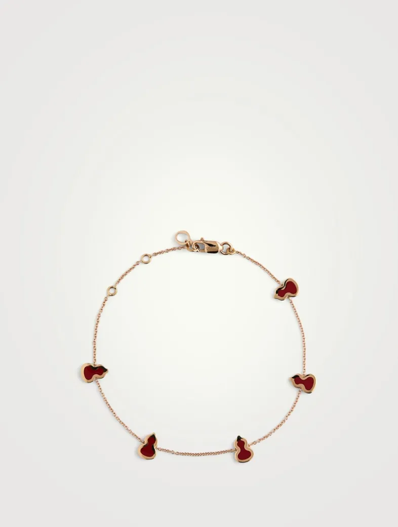 Echoing the curves of the lucky number 8, Wulu is the most powerful symbol of good fortune and positive energy in China. Pear-shaped charms of 18k gold and red enamel are stationed along this delicate sautoir chain bracelet.