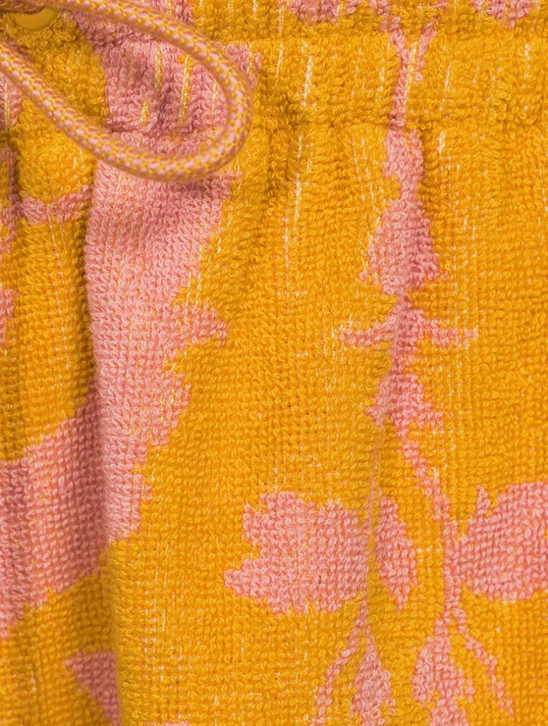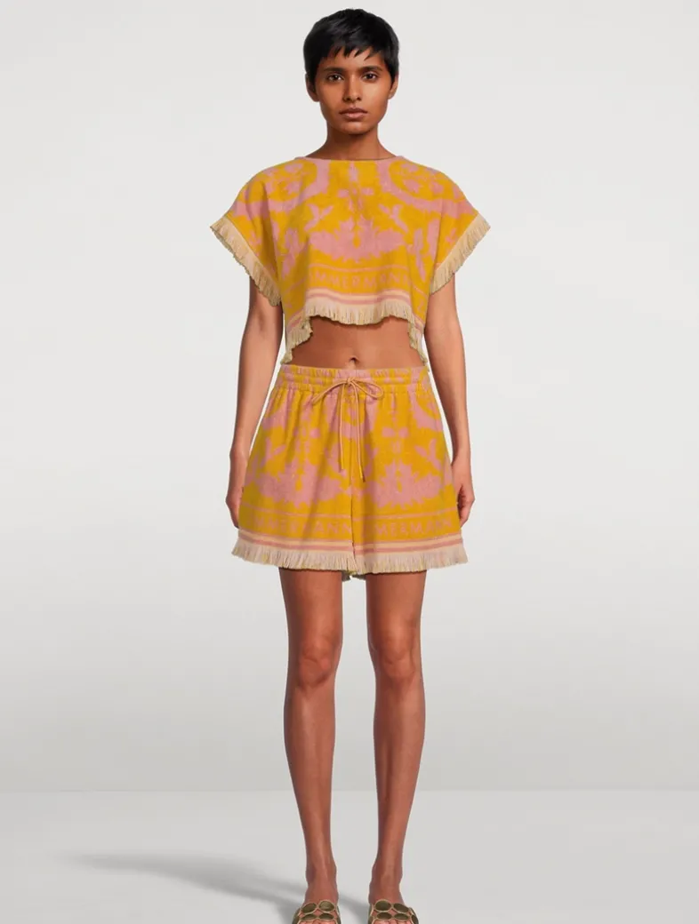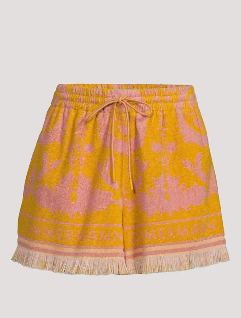 These cotton shorts are crafted in Portugal from a plush terrycloth fabric with a vibrant allover print. Cut in a relaxed silhouette, the drawstring pair are edged with fringe trim at the cuffs.