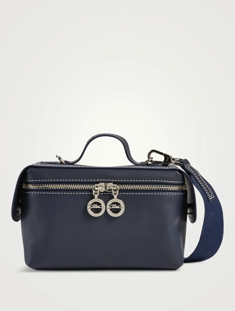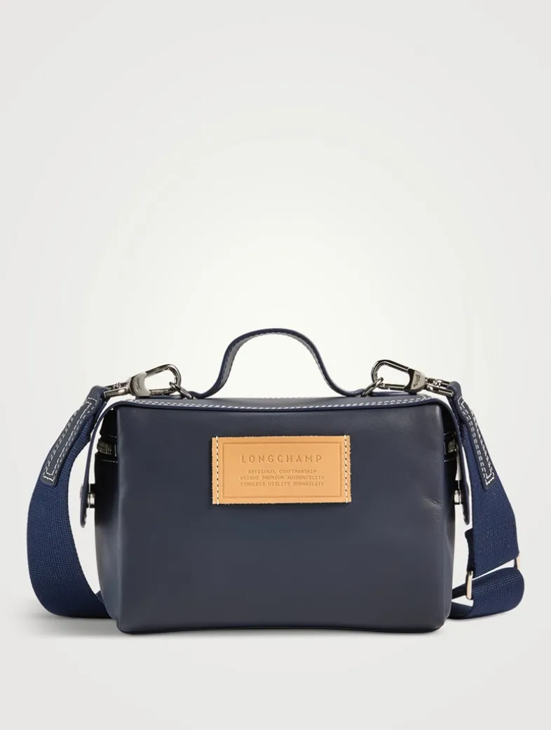 This mini cowhide leather vanity bag is reimagined in a playful tool box shape. It stands out with its contrast topstitching, handle, and removable shoulder strap, offering excellent practicality.