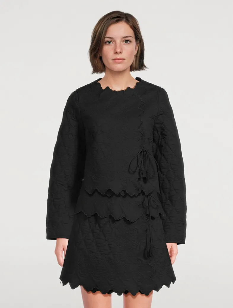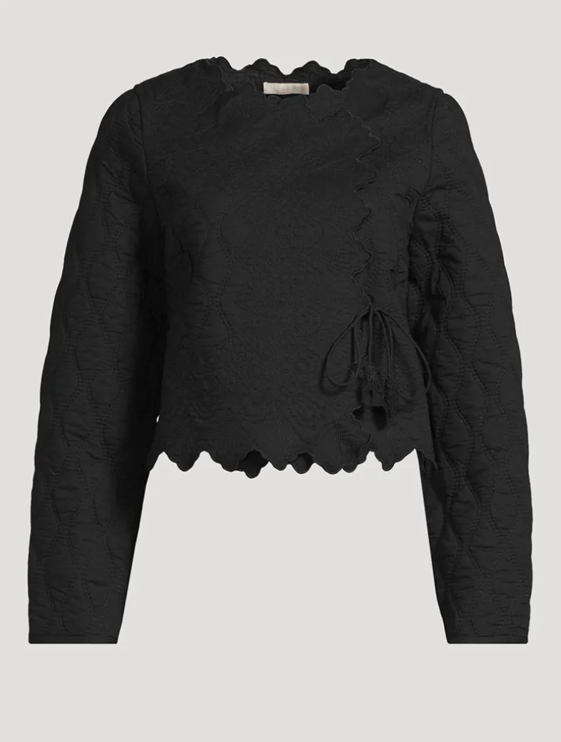 The Zofia Jacket comes alive with undulating diamonds artfully stitched throughout the silhouette. Inspired by Victorian quilting, this cotton voile jacket is lightly padded, has a wrap silhouette, and delicate front ties finished with handmade French knots. It is finished with beautifully geometric scalloping.